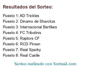 Lista de participantes: Real Castle, RCD Pirsen, FC Tribolinis, Real Sparky, Internacional Bertlkes, AD Trickles, Dinamo de Sharckzs, Raptors CF.