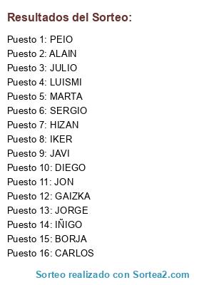 Lista de participantes: BORJA, MARTA, JAVI, JULIO, DIEGO, HIZAN, IKER, SERGIO, ALAIN, GAIZKA, JORGE, JON, LUISMI, PEIO, CARLOS, IÑIGO.