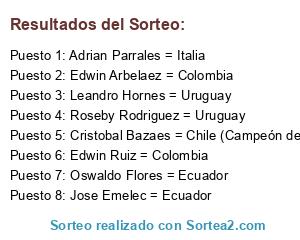 Lista de participantes: Edwin Arbelaez = Colombia, Edwin Ruiz = Colombia, Oswaldo Flores = Ecuador, Roseby Rodriguez = Uruguay, Jose Emelec = Ecuador, Cristobal Bazaes = Chile (Campeón de la LDA Serie A), Adrian Parrales = Italia, Leandro Hornes = Uruguay.