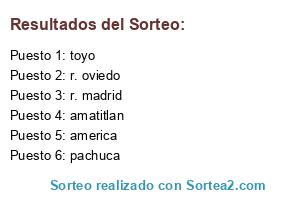 Lista de participantes: america, toyo, r. madrid, r. oviedo, amatitlan, pachuca.