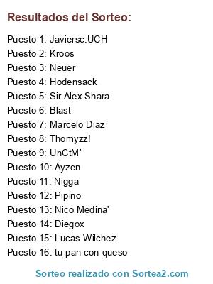 Lista de participantes: Javiersc.UCH, Sir Alex Shara, Thomyzz!, Blast, Nico Medina', UnCtM', Marcelo Diaz, Diegox, Lucas Wilchez, Hodensack, Ayzen, pipino, Kroos, tu pan con queso, Nigga, Neuer.
