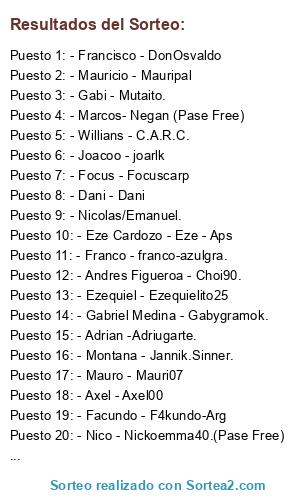 Lista de participantes: - Axel - Axel00, - Marcos- Negan (Pase Free), - Nico - Nickoemma40.(Pase Free), - Jorge - Jorge-Soto-Aps. (Pase Fre), - Pablo - Pablasa22., - Montana - Jannik.Sinner., - Sebastián - Sebax., - Gabriel Medina - Gabygramok., - Andres Figueroa - Choi90., - Franco - franco-azulgra., - Willians - C.A.R.C., - Gabi - Mutaito., - Eze Cardozo - Eze - Aps, - Adrian -Adriugarte., - Lucas Sebastian - IndioBenjamin., - Dani - Dani, - Cris Tate - Bugicio, - Rodrigue eze - Doki1098, - Joacoo - joarlk, - Daniel - Askelad, - Facundo - F4kundo-Arg, - Mauricio - Mauripal, - Nicolas/Emanuel., - Matias Abel - Abel09, - Seba Cordoba - Subseven, - Facundo - GOLEADO, - Focus - Focuscarp, - Mauro - Mauri07, - Elian - Nano07, - Thiago - Mantelcolcito, - Francisco - DonOsvaldo, - Ezequiel - Ezequielito25.
