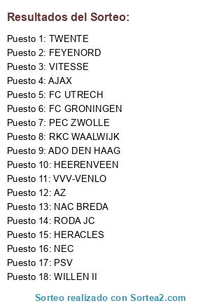 Lista de participantes: PSV, TWENTE, AJAX, FEYENORD, VITESSE, FC UTRECH, NEC, ADO DEN HAAG, RKC WAALWIJK, HERACLES, FC GRONINGEN, AZ, HEERENVEEN, PEC ZWOLLE, RODA JC, VVV-VENLO, NAC BREDA, WILLEN II.