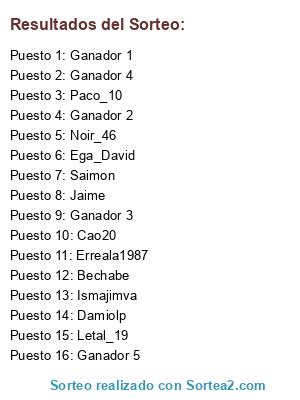 Lista de participantes: Erreala1987, Paco_10, Saimon, Ega_David, Noir_46, Ismajimva, Jaime, Letal_19, Bechabe, Cao20, Damiolp, Ganador 1, Ganador 2, Ganador 3, Ganador 4, Ganador 5.