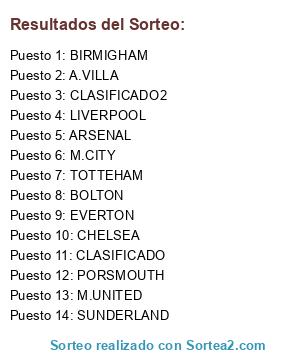 Lista de participantes: CLASIFICADO, BIRMIGHAM, BOLTON, LIVERPOOL, PORSMOUTH, TOTTEHAM, CLASIFICADO2, M.CITY, EVERTON, SUNDERLAND, CHELSEA, M.UNITED, ARSENAL, A.VILLA.