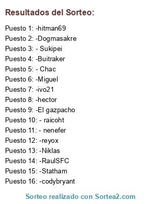 Lista de participantes: - raicoht, - nenefer, -hector, -Miguel, - Chac, - Sukipei, -Niklas, -RaulSFC, -reyox, -Dogmasakre, -Statham, -El gazpacho, -Buitraker, -ivo21, -codybryant, -hitman69.