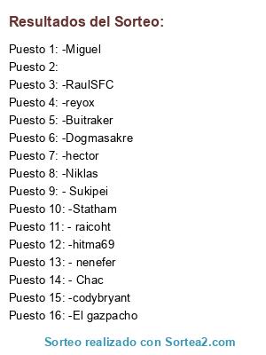 Lista de participantes: - raicoht, - nenefer, -hector, -Miguel, - Chac, - Sukipei, -Niklas, -RaulSFC, -reyox, -Dogmasakre, -Statham, -El gazpacho, -Buitraker, -ivo21, -codybryant, -hitma69, .