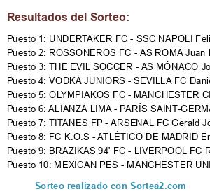 Lista de participantes: MEXICAN PES - MANCHESTER UNITED Jorge Luis Castillo Garcia, TITANES FP - ARSENAL FC Gerald Josue, ROSSONEROS FC - AS ROMA Juan Manuel Cartagena, BRAZIKAS 94' FC - LIVERPOOL FC Rivaldo Brazikas, THE EVIL SOCCER - AS MÓNACO Jona Díaz, VODKA JUNIORS - SEVILLA FC Daniel Vidal, FC K.O.S - ATLÉTICO DE MADRID ErJu So, OLYMPIAKOS FC - MANCHESTER CITY Alex Trujillo, ALIANZA LIMA - PARÍS SAINT-GERMAIN Maximiliano Herrera, UNDERTAKER FC - SSC NAPOLI Felipe Israel Bajaña Tumbaco.