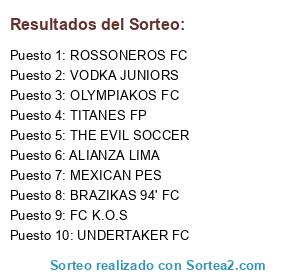 Lista de participantes: TITANES FP, UNDERTAKER FC, OLYMPIAKOS FC, VODKA JUNIORS, FC K.O.S, ROSSONEROS FC, BRAZIKAS 94' FC, THE EVIL SOCCER, ALIANZA LIMA, MEXICAN PES.