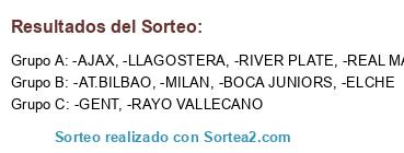 Lista de participantes: -ELCHE, -GENT, -AJAX, -RIVER PLATE, -BOCA JUNIORS, -MILAN, -REAL MADRID, -RAYO VALLECANO, -LLAGOSTERA, -AT.BILBAO.
