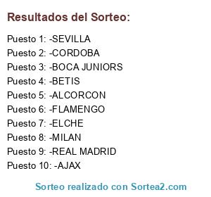 Lista de participantes: -SEVILLA, -FLAMENGO, -BETIS, -REAL MADRID, -ALCORCON, -AJAX, -CORDOBA, -ELCHE, -BOCA JUNIORS, -MILAN.