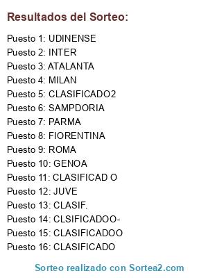 Lista de participantes: PARMA, GENOA, JUVE, FIORENTINA, MILAN, UDINENSE, ROMA, INTER, ATALANTA, SAMPDORIA, CLASIFICADO, CLASIFICADOO, CLASIFICADO2, CLASIF., CLASIFICAD O, CLSIFICADOO-.