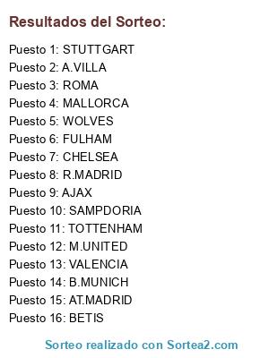 Lista de participantes: A.VILLA , WOLVES , SAMPDORIA , MALLORCA , AT.MADRID , BETIS , CHELSEA , B.MUNICH , R.MADRID , STUTTGART , VALENCIA , AJAX , M.UNITED , ROMA , TOTTENHAM , FULHAM.