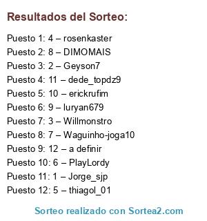 Lista de participantes: 1 – Jorge_sjp , 2 – Geyson7, 3 – Willmonstro, 4 – rosenkaster , 5 – thiagol_01 , 6 – PlayLordy, 7 – Waguinho-joga10, 8 – DIMOMAIS, 9 – luryan679, 10 – erickrufim, 11 – dede_topdz9, 12 – a definir.