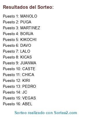 Lista de participantes: KIRI, CHICA, PUGA, JC, PEDRO, MANOLO, BORJA, KIKOCHI, DAVO, VEGAS, MARTINEZ, CASTE, KICAS, ABEL, LALO, JUANMA.