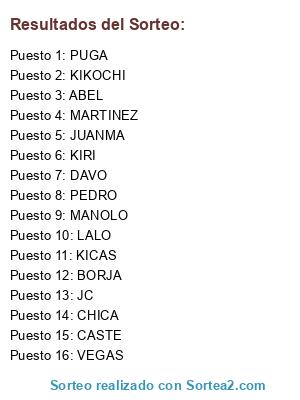 Lista de participantes: KIRI, CHICA, PUGA, JC, PEDRO, MANOLO, BORJA, KIKOCHI, DAVO, VEGAS, MARTINEZ, CASTE, KICAS, ABEL, LALO, JUANMA.
