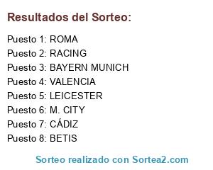 Lista de participantes: RACING, BAYERN MUNICH, CÁDIZ, LEICESTER, M. CITY, ROMA, BETIS, VALENCIA.