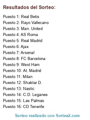 Lista de participantes: At. Madrid, Shaktar D., C.D. Leganes, Man. United, Nastic, Las Palmas, Rayo Vallecano, Arsenal, Milan, AS Roma, CD Tenerife, Ajax, Real Madrid, West Ham, Real Betis, FC Barcelona.