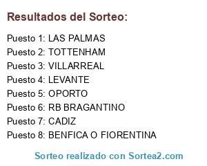 Lista de participantes: OPORTO, RB BRAGANTINO, CADIZ, LAS PALMAS, BENFICA O FIORENTINA, VILLARREAL, TOTTENHAM, LEVANTE.
