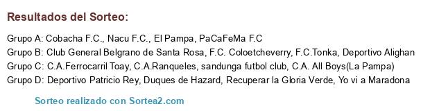 Lista de participantes: sandunga futbol club, C.A. All Boys(La Pampa), Duques de Hazard, C.A.Ferrocarril Toay, Cobacha F.C., C.A.Ranqueles, Yo vi a Maradona, El Pampa, F.C.Tonka, PaCaFeMa F.C, F.C. Coloetcheverry, Club General Belgrano de Santa Rosa, Deportivo Patricio Rey, Deportivo Alighan, Recuperar la Gloria Verde, Nacu F.C..