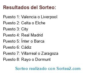 Lista de participantes: Rayo o Dormunt, Villarreal o Zaragoza, Cádiz, City, Real Madrid, Celta o Elche, Ínter o Barca, Valencia o Liverpool.