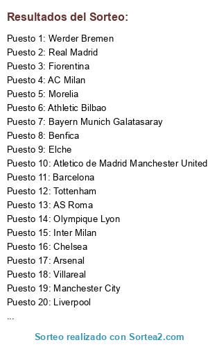 Lista de participantes: Morelia , Manchester City , Arsenal , Barcelona , Liverpool , Chelsea , Atletico de Madrid Manchester United Valencia , Real Madrid, Inter Milan , AC Milan , Tottenham , Olympique Lyon , AS Roma , Athletic Bilbao, Elche , Aston Villa, Sevilla , Juventus , Bayern Munich Galatasaray , Hoffenheim, Marsella, Burdeos, Werder Bremen, Fiorentina, Villareal, Sttutgart, Benfica, Ganador Porto vs Everton, Ganador Wolfs vs Hamburg.
