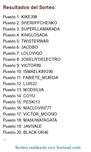 Lista de participantes: BUBO_79, SHERIIFFCHENKO, SUPERLLAMARADA, JOSELIYOELECTRO, JAVIVALE, PODERNEGRITO, COYU, VICTOR80, VICTOR_MOONO, LIDER2112, MACLOVIN777, KINGLOSADA, LOLOVIGO, BOGARDE9, ISMAELKING90, JIMENYSTERROOY86, JACOBO, FABIETE_MURCIA, HERREROS_88, LUIS22, ROQUELUIS, TWISTERWAR, MALAGUEO, RUII99, PESKI13, JUANMA641990, KIKE398, GORRI7, MODSILVA, MANUWATAGATA, BLACK-UR46, IGNASIO1201.