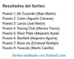 Lista de participantes: Huracán (Martin Castillo), Colon (Agustín Cáceres), Lanús (Joel Berón), Banfield (Alejandro Aguirre), River Plate (Alejandro Ayala), Boca Jrs (Emánuel Rodrigo), Atl Tucumán (Maxi Martin), Racing Club (Marcos Tisoco).