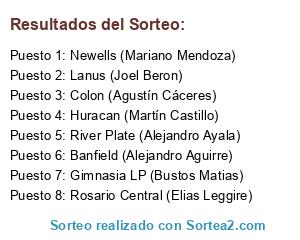 Lista de participantes: Huracan (Martín Castillo), Lanus (Joel Beron), Newells (Mariano Mendoza), Banfield (Alejandro Aguirre), Rosario Central (Elias Leggire), Colon (Agustín Cáceres), River Plate (Alejandro Ayala), Gimnasia LP (Bustos Matias).