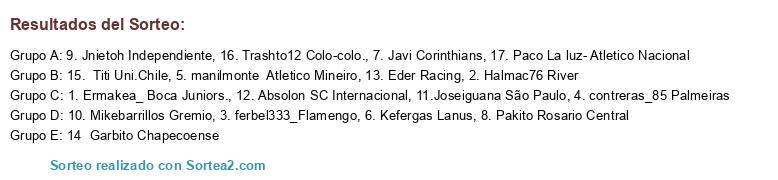 Lista de participantes: 1. Ermakea_ Boca Juniors., 2. Halmac76 River, 3. ferbel333_Flamengo, 4. contreras_85 Palmeiras, 5. manilmonte Atletico Mineiro, 6. Kefergas Lanus, 7. Javi Corinthians, 8. Pakito Rosario Central, 9. Jnietoh Independiente, 10. Mikebarrillos Gremio, 11.Joseiguana São Paulo, 12. Absolon SC Internacional, 13. Eder Racing, 14 Garbito Chapecoense, 15. Titi Uni.Chile, 16. Trashto12 Colo-colo., 17. Paco La luz- Atletico Nacional.