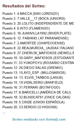 Lista de participantes: 1 XAVILOKO (SANTOS), 2.AMORTEE (CHAPECOENSE), 3.FISTA (VELEZ), 4.MACCA (SAN LORENZO), 5.CINDE (UNION ESPAÑOLA), 6.INTO (FLAMENGO), 7.VALLE__17 (BOCA JUNIORS), 8.BARICELLI (AMÉRICA DE CALI), 9. VAZQUEZBOOK82 (SAO PAULO), 10. SHERIFCHENKO (BELGRANO), 11. KASEO_CREW_ (HURACAN), 12. FABIANO ( AT PARANAENSE), 13. ELVIS_TARBOS (LANUS), 14. BELLOTO (PALMEIRAS), 15.AYO_ESP (MILLONARIOS), 16.JUANVILLA1992 (RIVER PLATE), 17.DANIDANTE (CORINTHIANS), 18. FARBAX ETTORITO (EVERTON), 19.VIDALSERGI (BANFIELD), 20.LOLITO (INDEPENDIENTE DE MEDELLIN), 21.ELMANUE_15 (SAN LUIS), 22.REALMURCIA_ (AUDAX ITALIANO), 23.SERGIO (O.HIGGINS), 24.PABLOCUSAN (PALESTINO), 25.METRAL_MAFIOSOS (VASCO DE GAMA), 26.DIEGO SALAS (GREMIO), 27.CHERU30_MAFIOSOS (NEWELLS), 28.RUBEN (DEPORTES TOLIMA), 29.JOSE (YASUP_YUN) (CRUZEIRO), 30.GARY_MAFIOSOS (ESTUDIANTES), 31.FERRARI (BOTAFOGO), 32.BLINDCAT91 (ONCE CALDAS), 33.YUKOPOYU (ROSARIO CENTRAL, ..