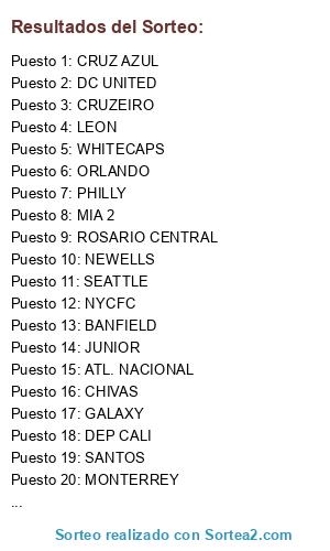Lista de participantes: TOLUCA, DEP CALI, LEON, GREMIO, DC UNITED, SANTOS, ROSARIO CENTRAL, WHITECAPS, GALAXY, ATL. NACIONAL, NEWELLS, MONTERREY, CRUZEIRO, MIA 1, JUNIOR, ORLANDO, CHIVAS, CRUZ AZUL, NYCFC, BANFIELD, SEATTLE, TIGRES, MIA 2, PHILLY.