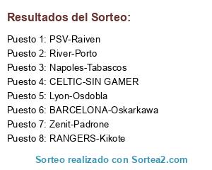 Lista de participantes: PSV-Raiven, RANGERS-Kikote, CELTIC-SIN GAMER, River-Porto, Napoles-Tabascos, Zenit-Padrone, BARCELONA-Oskarkawa, Lyon-Osdobla.