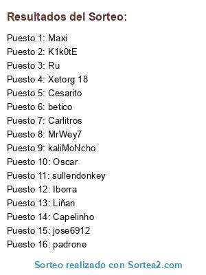 Lista de participantes: MrWey7, jose6912, Liñan, kaliMoNcho, Oscar, Carlitros, betico, Capelinho, padrone, sullendonkey, Maxi, Iborra, Cesarito, Xetorg 18, Ru, K1k0tE.