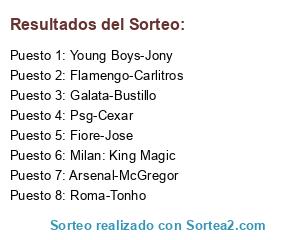 Lista de participantes: Flamengo-Carlitros, Young Boys-Jony, Psg-Cexar, Roma-Tonho, Fiore-Jose, Galata-Bustillo, Arsenal-McGregor, Milan: King Magic.