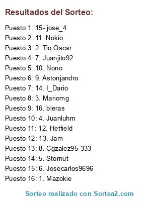 Lista de participantes: 1. Mazokie, 2. Tio Oscar, 3. Mariomg, 4. Juanluhm, 5. Stornut, 6. Josecarlos9696, 7. Juanjito92, 8. Cgzalez95-333, 9. Astonjandro, 10. Nono, 11. Nokio, 12. Hetfield, 13. Jam, 14. I_Dario, 15- jose_4, 16. bleras.
