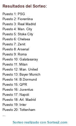 Lista de participantes: Man. United, Schalke 04, Liverpool, Stoke City, Milan, Barcelona, Napoli, Bayer Munich, QPR, Fernerbahce, Roma, Arsenal, Zenit, PSG, Real Madrid, Tottenham, Fiorentina, Chelsea, B.Dormund, Inter, Arl. Madrid, Juventus, Man. City, Galatasaray.