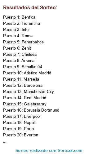 Lista de participantes: Tottenham, Chelsea, Fenerbahce, Bayern Munich, Zenit, Liverpool, Arsenal, Barcelona, Atletico Madrid, Inter, Porto, Marsella, Manchester City, Juventus, Real Madrid, Fiorentina, Galatasaray, Benfica, Schalke 04, Milan, Roma, Borussia Dortmund, Napoli, Everton.