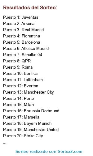 Lista de participantes: Chelsea, Bayern Munich, Manchester United, Fenerbahce, QPR, Tottenham, Barcelona, Schalke 04, Manchester City, Borussia Dortmund, Arsenal, Stoke City, Real Madrid, Milan, Atletico Madrid, Marsella, Fiorentina, Roma, Juventus, Inter, Galatasaray, Everton, Benfica, Porto.