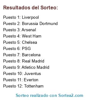 Lista de participantes: PSG, Barcelona, Chelsea, Real Madrid, Arsenal, Borussia Dortmund, Atletico Madrid, Tottenham, Juventus, Liverpool, Everton, West Ham.