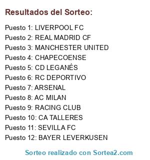 Lista de participantes: AC MILAN, ARSENAL, BAYER LEVERKUSEN, CA TALLERES, CD LEGANÉS, CHAPECOENSE, LIVERPOOL FC, MANCHESTER UNITED, RACING CLUB, RC DEPORTIVO, REAL MADRID CF, SEVILLA FC.