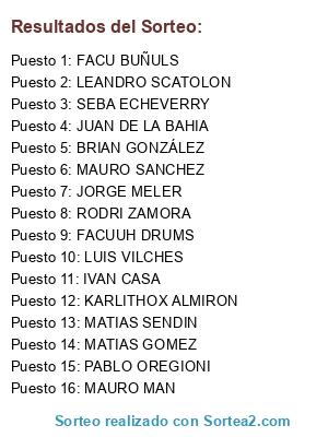 Lista de participantes: MAURO MAN, JORGE MELER, RODRI ZAMORA, SEBA ECHEVERRY, LUIS VILCHES, BRIAN GONZÁLEZ, FACUUH DRUMS, JUAN DE LA BAHIA, IVAN CASA, PABLO OREGIONI, FACU BUÑULS, MATIAS GOMEZ, MATIAS SENDIN, LEANDRO SCATOLON, MAURO SANCHEZ, KARLITHOX ALMIRON.