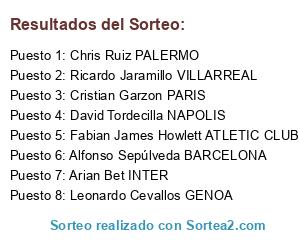 Lista de participantes: Alfonso Sepúlveda BARCELONA, Leonardo Cevallos GENOA, Chris Ruiz PALERMO, Cristian Garzon PARIS, David Tordecilla NAPOLIS, Fabian James Howlett ATLETIC CLUB, Arian Bet INTER, Ricardo Jaramillo VILLARREAL.