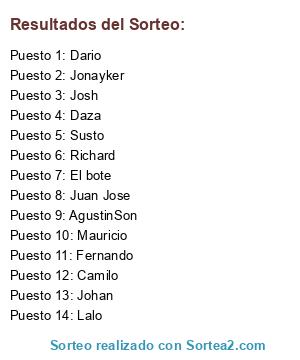 Lista de participantes: Daza, Susto, Fernando, Lalo, AgustinSon, Jonayker, Richard, Dario, El bote, Johan, Josh, Juan Jose, Camilo, Mauricio.