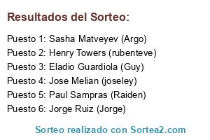 Lista de participantes: Jorge Ruiz (Jorge), Paul Sampras (Raiden), Henry Towers (rubenteve), Sasha Matveyev (Argo), Eladio Guardiola (Guy), Jose Melian (joseley).