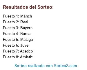 Lista de participantes: Barca, Manch, Bayern, Real, Juve, Atletico, Athletic, Malaga.