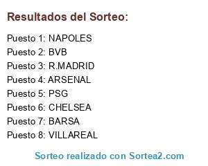 Lista de participantes: PSG, NAPOLES, BARSA, CHELSEA, R.MADRID, VILLAREAL, BVB, ARSENAL.