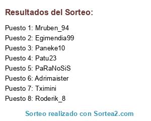 Lista de participantes: Roderik_8, Patu23, PaRaNoSiS, Paneke10, Egimendia99, Adrimaister, Tximini, Mruben_94.