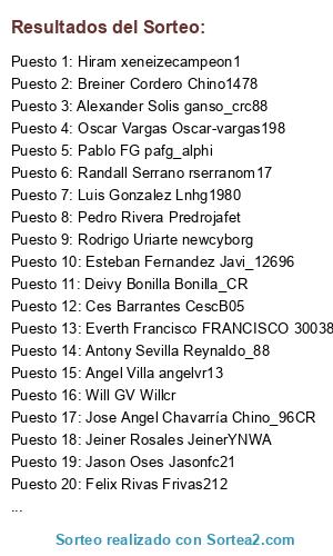 Lista de participantes: Hiram xeneizecampeon1, Joaf Arroyo jgavCR, Freddy Porras Josupm19, Alexander Solis ganso_crc88, Angel Villa angelvr13, Antony Sevilla Reynaldo_88, Pablo FG pafg_alphi, Jose Angel Chavarría Chino_96CR, Andrey Bogantes AndreyBogantes, Everth Francisco FRANCISCO 300385, Jeiner Rosales JeinerYNWA, Ces Barrantes CescB05, JOrdan MOra jordan_mora77, Esteban Fernandez Javi_12696, Luis Marin LMarin17, Ron Cordoba rcordobacr, Aguilar Ed AerialEdson, Jason Oses Jasonfc21, Josue Mora josuecr1014, Luis Gonzalez Lnhg1980, Oscar Vargas Oscar-vargas198, Pedro Rivera Predrojafet, Rodrigo Uriarte newcyborg, HC Allen Allenh07, Felix Rivas Frivas212, Armando Abarca Pinchales90, Jorge Jenkins Jjjpeine2, Randall Serrano rserranom17, Andrey AP AndreyElteam, Will GV Willcr, Breiner Cordero Chino1478, Deivy Bonilla Bonilla_CR.