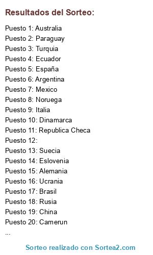 Lista de participantes: ALEMANIA, ARGENTINA, BRASIL, CAMERÚN, COLOMBIA, COSTA MARFIL, CHILE, ESPAÑA, FRANCIA, GALES, HOLANDA, INGLATERRA, MÉXICO, POLONIA, PORTUGAL, URUGUAY.